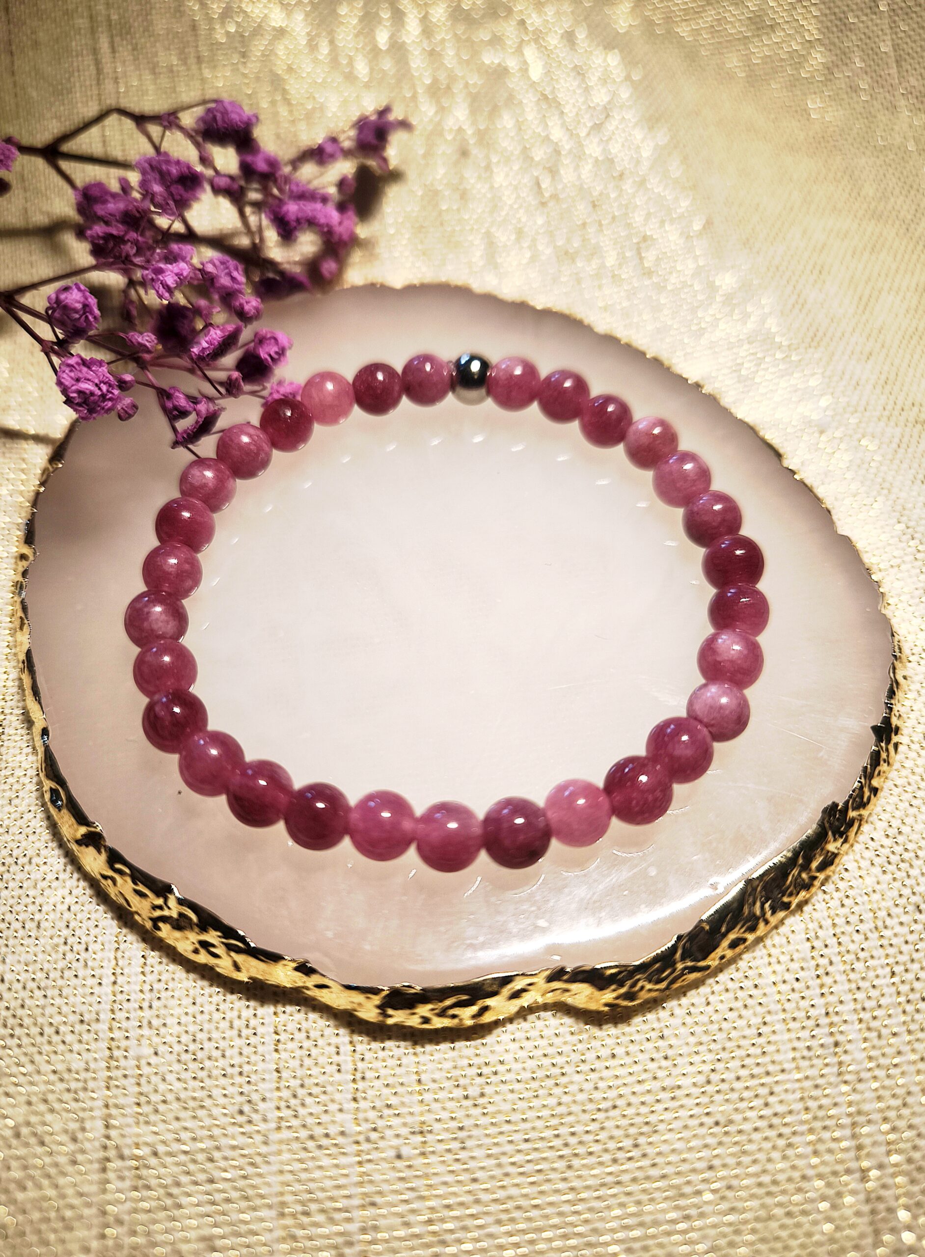 Ce bracelet en lépidolite dévoile de subtils reflets rosés et violacés, offrant un bijou délicat, raffiné et lumineux. Chaque perle est choisie pour sa qualité et son aspect naturellement nuancé.
